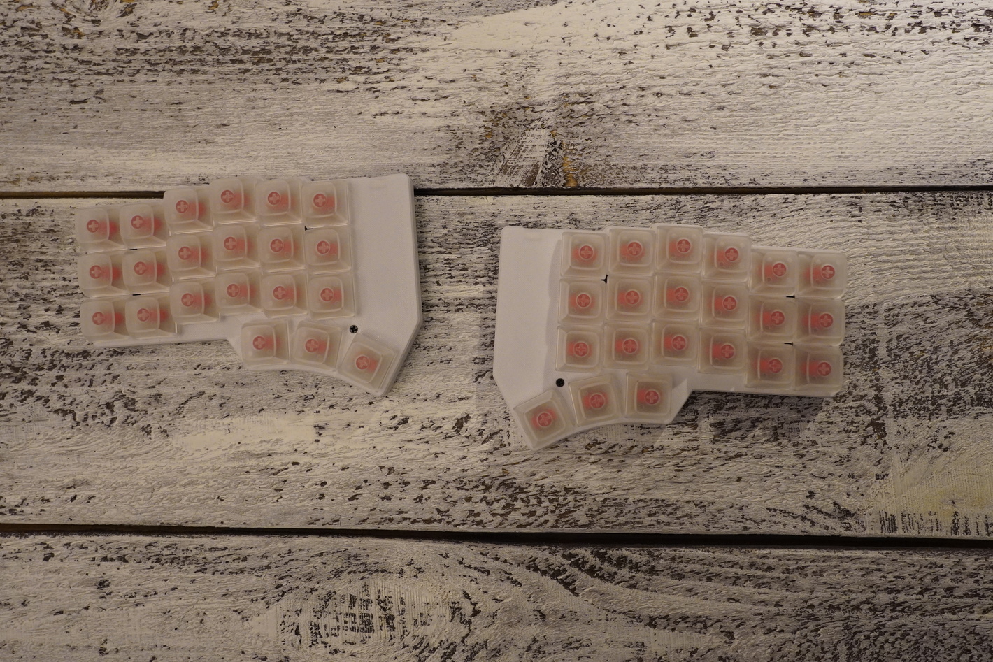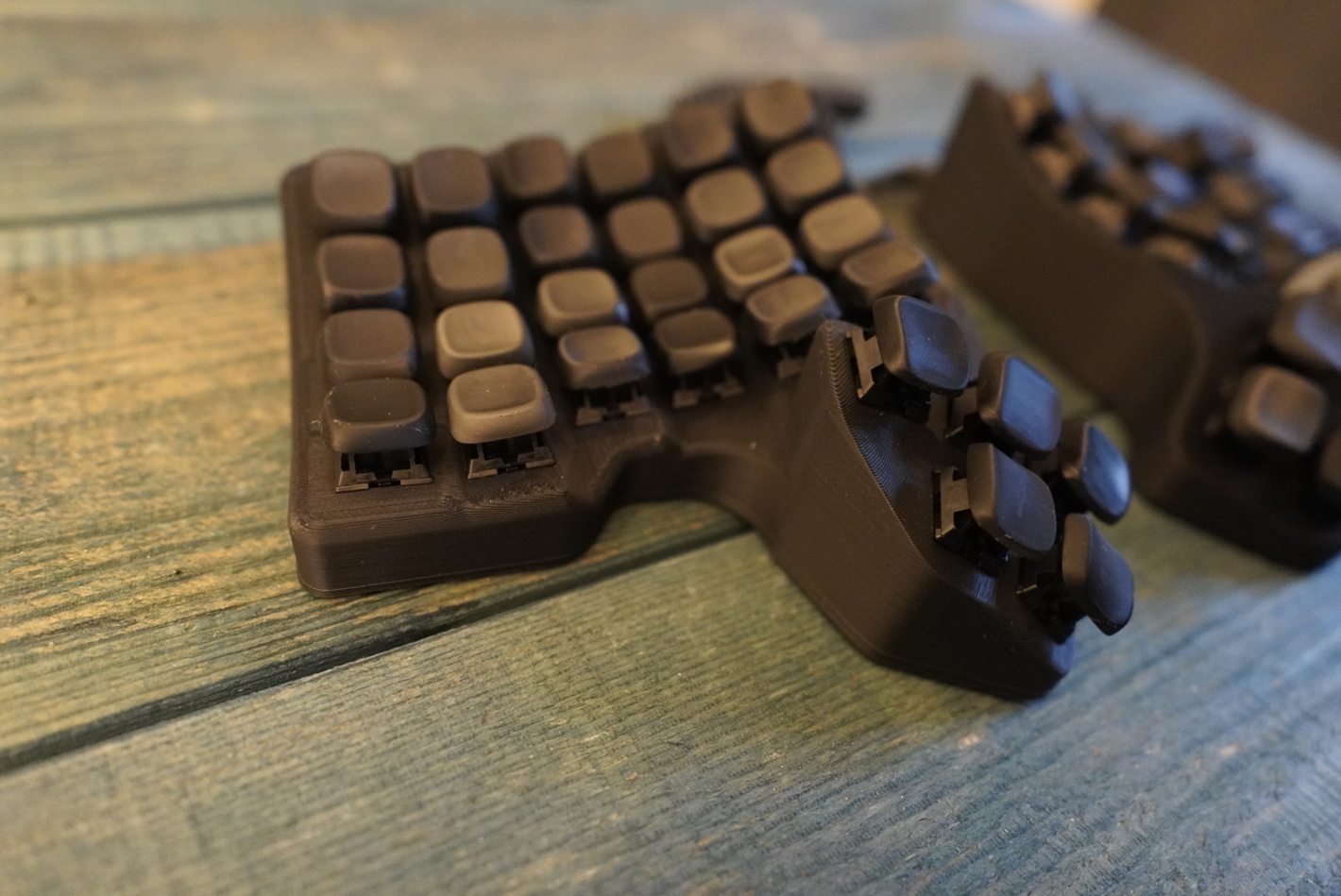 У этой клавиатуры есть два варианта корпуса. Последний вариант значительно более удачный с точки зрения эстетики. Клавиатура в новом корпусе выглядит просто идеально. Хоть, конечно, новый корпус и значительно больше весит, чем старый (из-за толстых стенок). Кстати, рекомендую печатать корпус из композитного угленаполненного пластика, хоть выходит и дорого, но внешний вид получается невероятно красивым. В последнем варианте корпуса, сам корпус с боков закрывает боковины свитчей. В первом же варианте корпуса он был типа "скелетул" и все было видно.