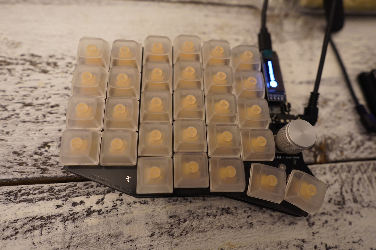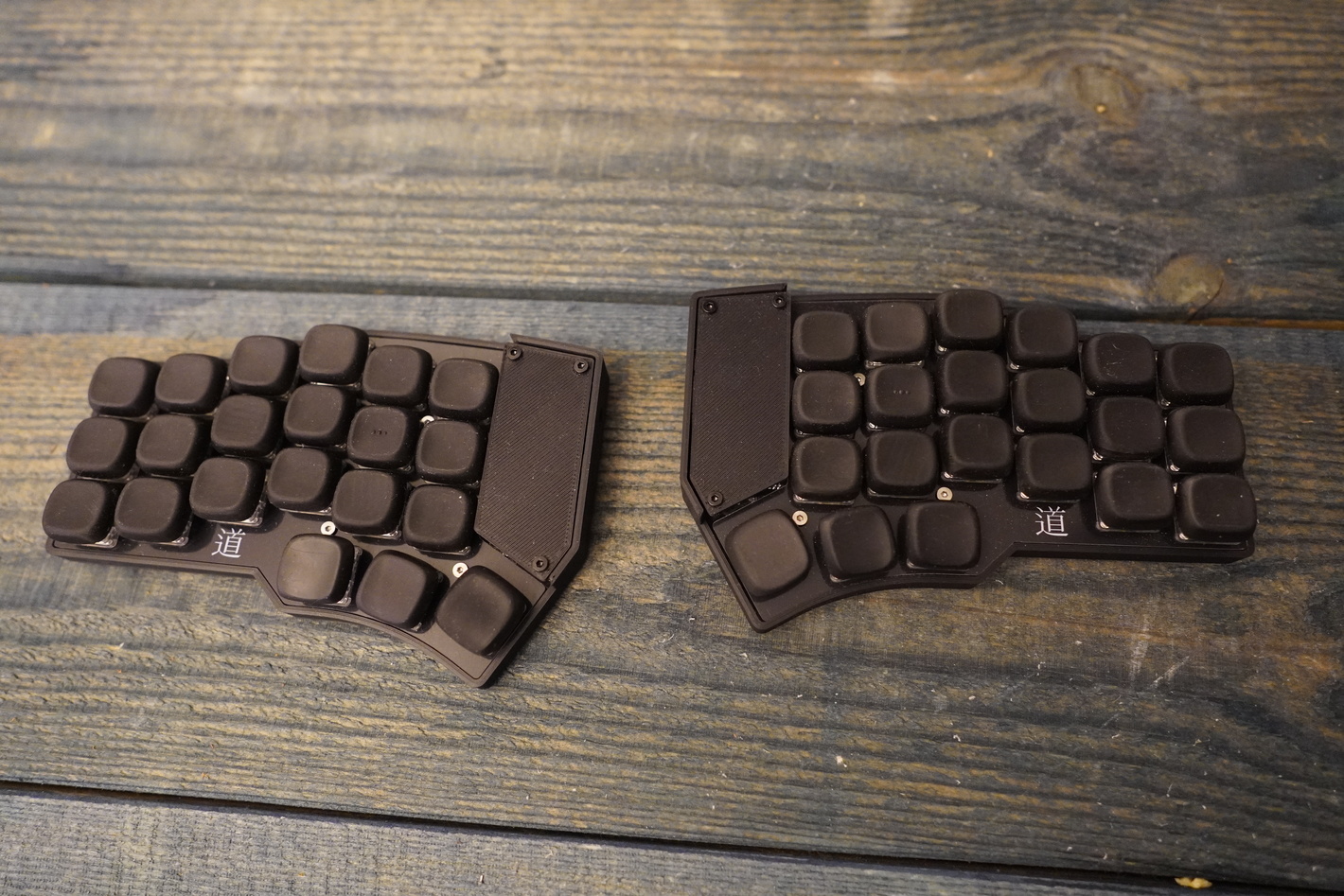 Дао до сих пор является одной из самых эстетически красивых раздельных клавиатур. Очень приятно сделан корпус и шильдик над батареей. Из-за хорошей компоновки и довольно низко расположенного контроллера абсолютно не видно батареи. А сам шильдик идет вровень с капами, что выглядит очень привлекальным.