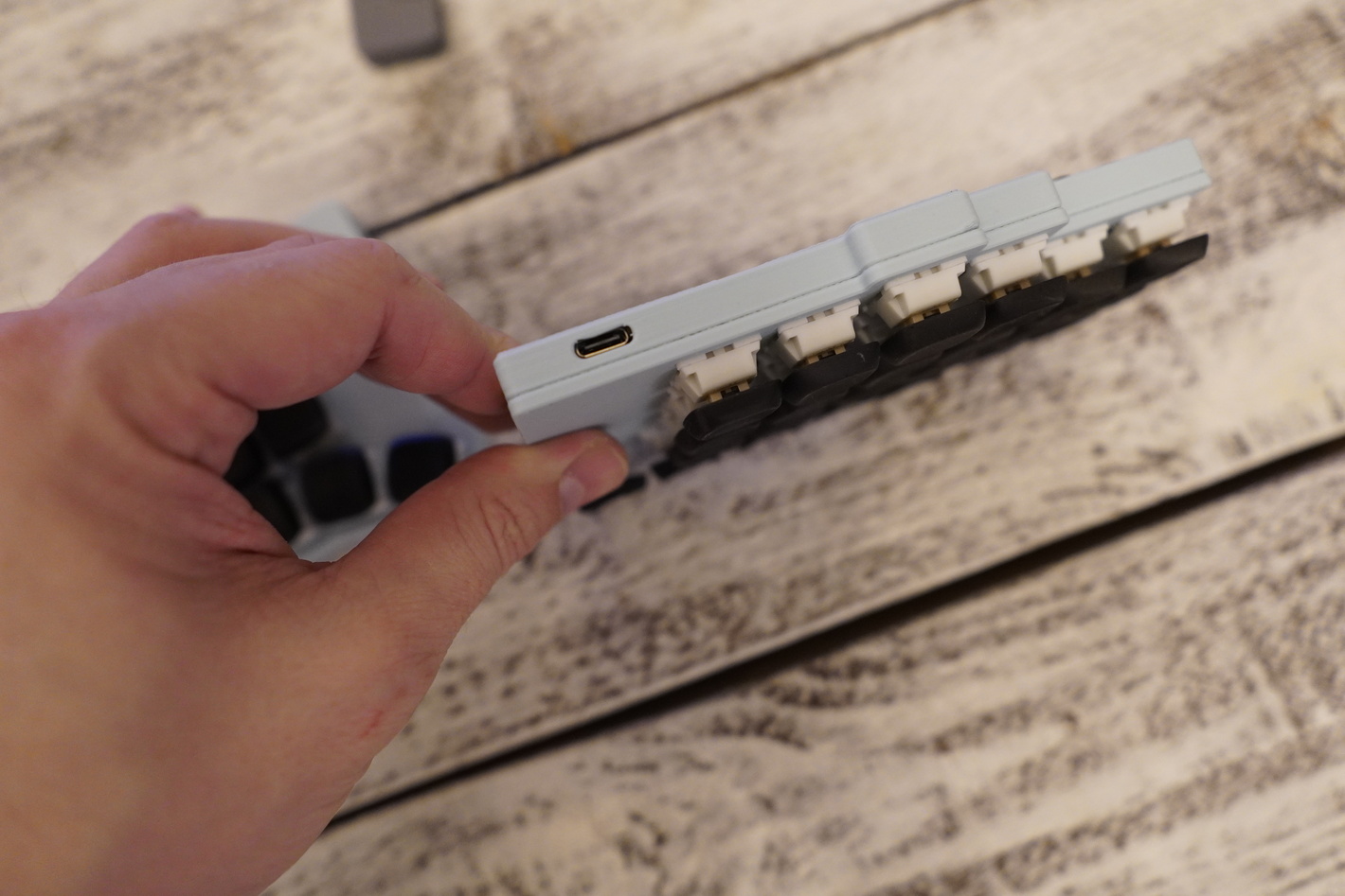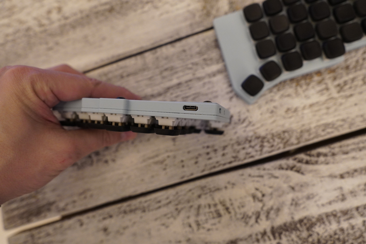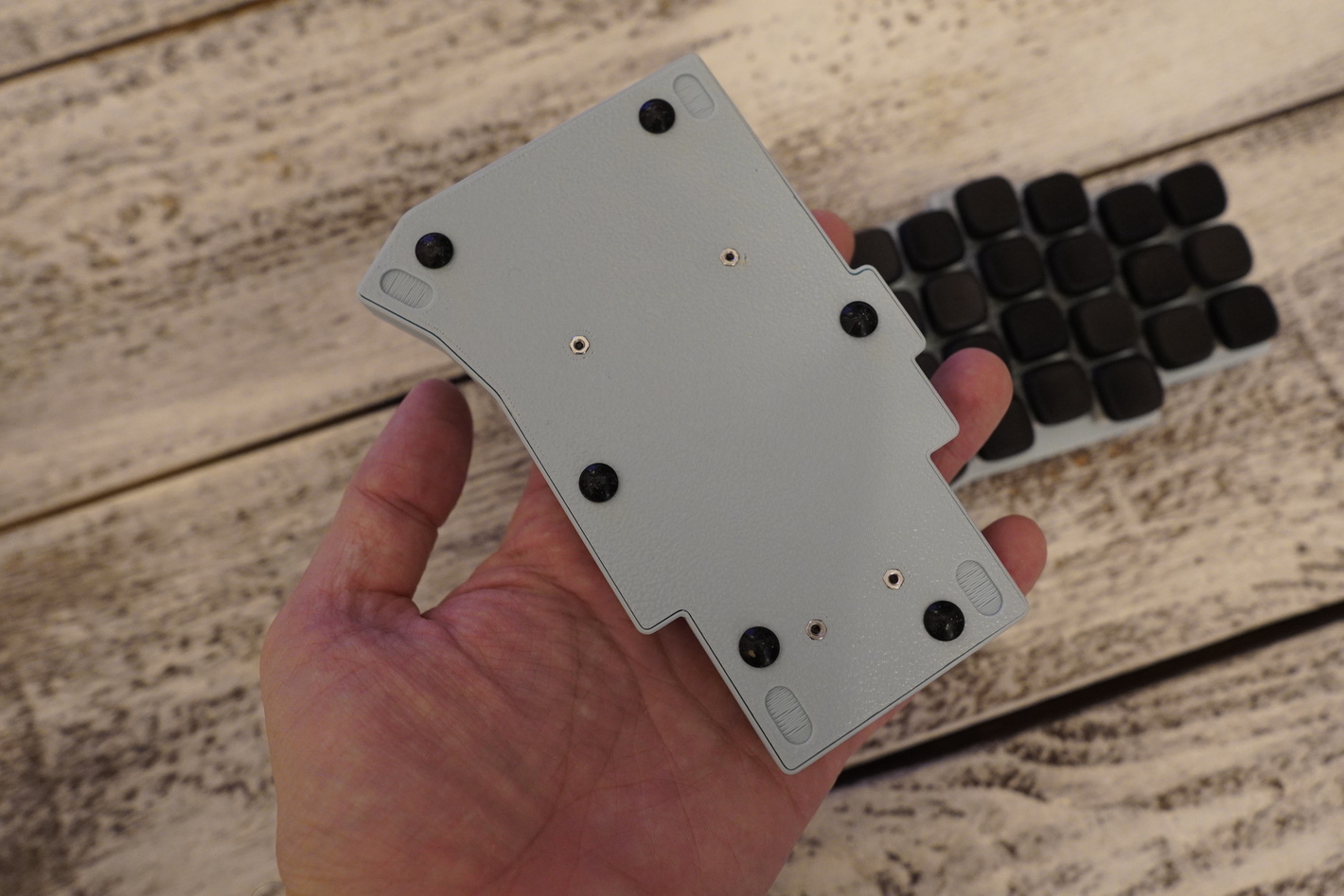 Клавиатура Flake на MX свитчах Есть хотсвап, свитчи outemu silent cream yellow Донгл на xiao в корпусе Капы KLP Lame напечатанные на фотополимерном принтере по технологии SLA из rigid смолы (это что-то типа композитной, прочной смолы в которую добавлена керамическая крошка). Капы сделал braindefender, посмотреть можно тут - https://github.com/braindefender/KLP-Lame-Keycaps Батарейки по 150mah в каждой половине