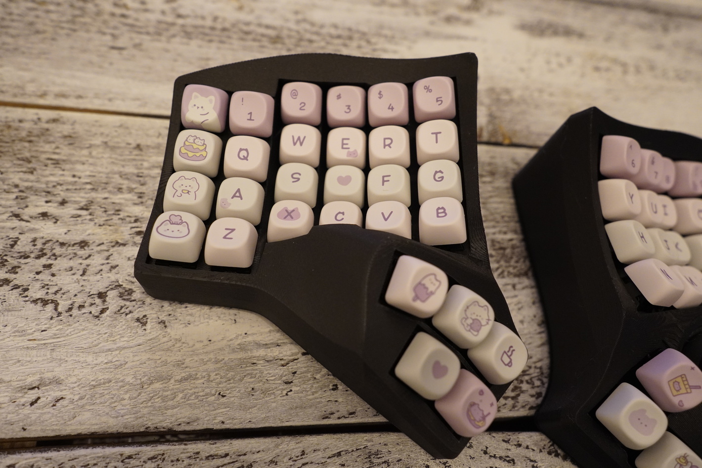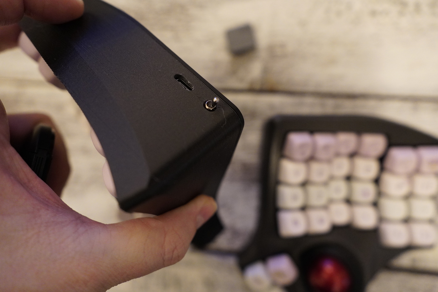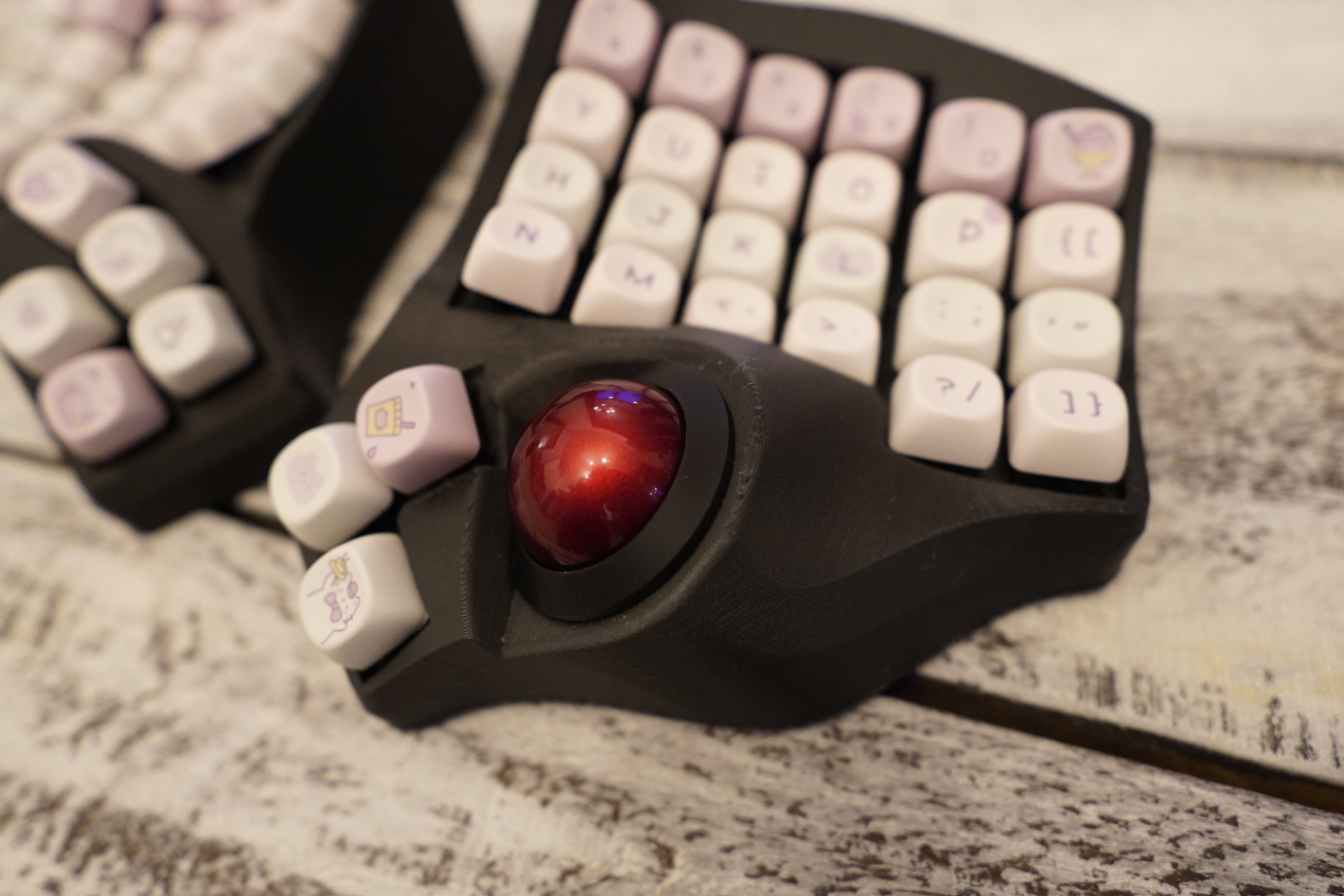 Charybdis 4-6 в корпусе новой версии. Сам корпус напечатан из композитного угленаполненного материала. На корпусе новые выключатели (если раньше они были снизу, то теперь это переключатель сзади). Сам корпус темно-серого цвета. Это беспроводная версия клавиатуры. Работает на ZMK. Батареи по 900mah. Работает через донгл. Донгл на xiao в корпусе. Свитчи - Gazzew Boba BLACK U4t V2 Thocky Tactile В клавиатуре шар perixx и держатель трекбола, который распечатан на фотополимернике Капы MOA профиля, как на картинке