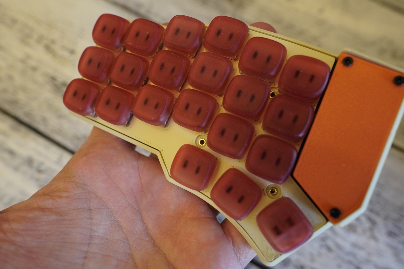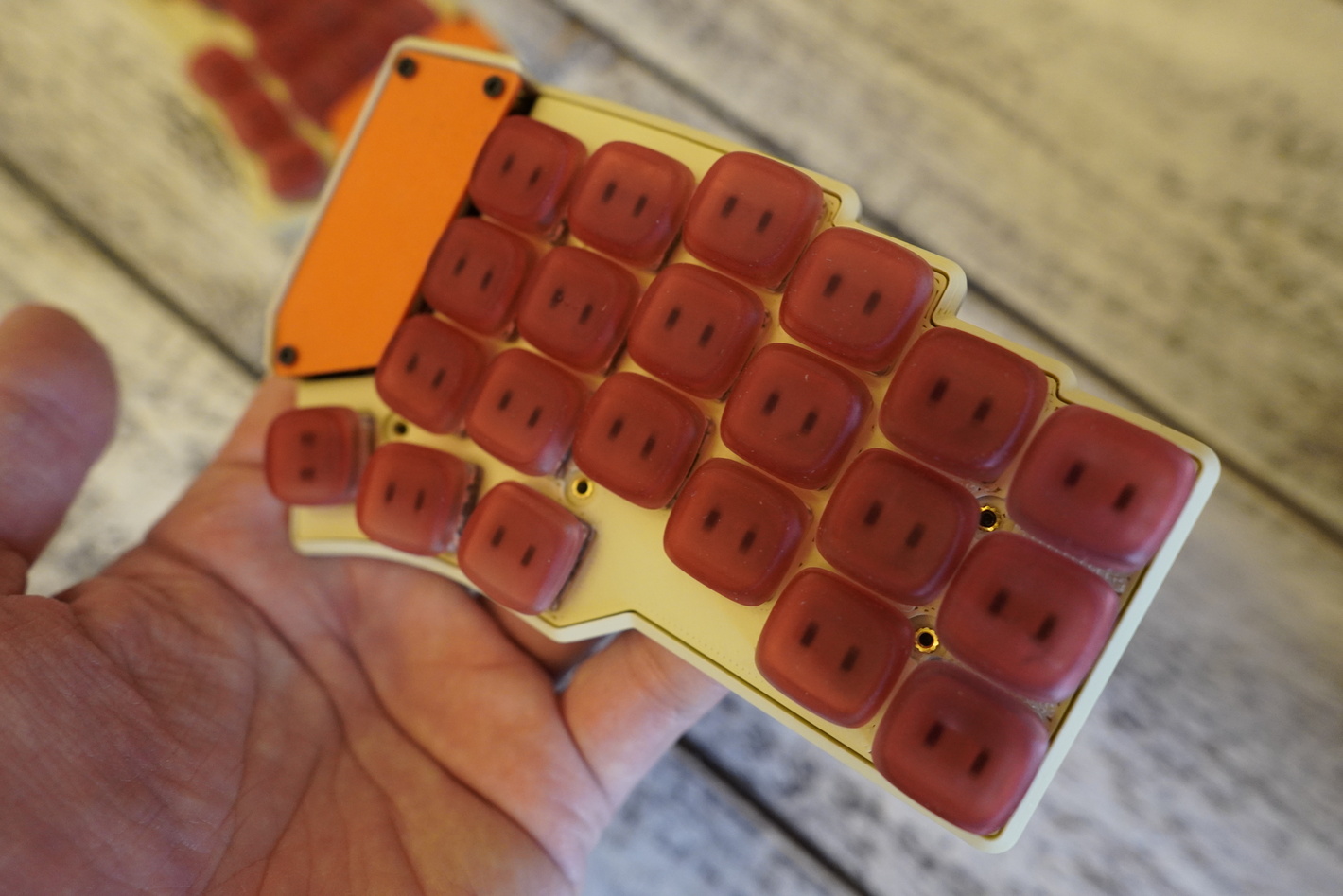 Раздельная низкопрофильная клавиатура DAO В каждой половине батарея по 300mah Свитчи в клавиатуре низкопрофильные Kailh Choc Silver Капы стоят KLP LAME CHOC от @braindefender. Это капы с моим любимым профилем. Разпечатаны на фотополимернике 9k из композитной rigid смолы с керамической крошкой. Корпус сделан максимально тонким, тут не используются спейсеры, плата прилегает плотно к низу и верху корпуса. Работает на ZMK