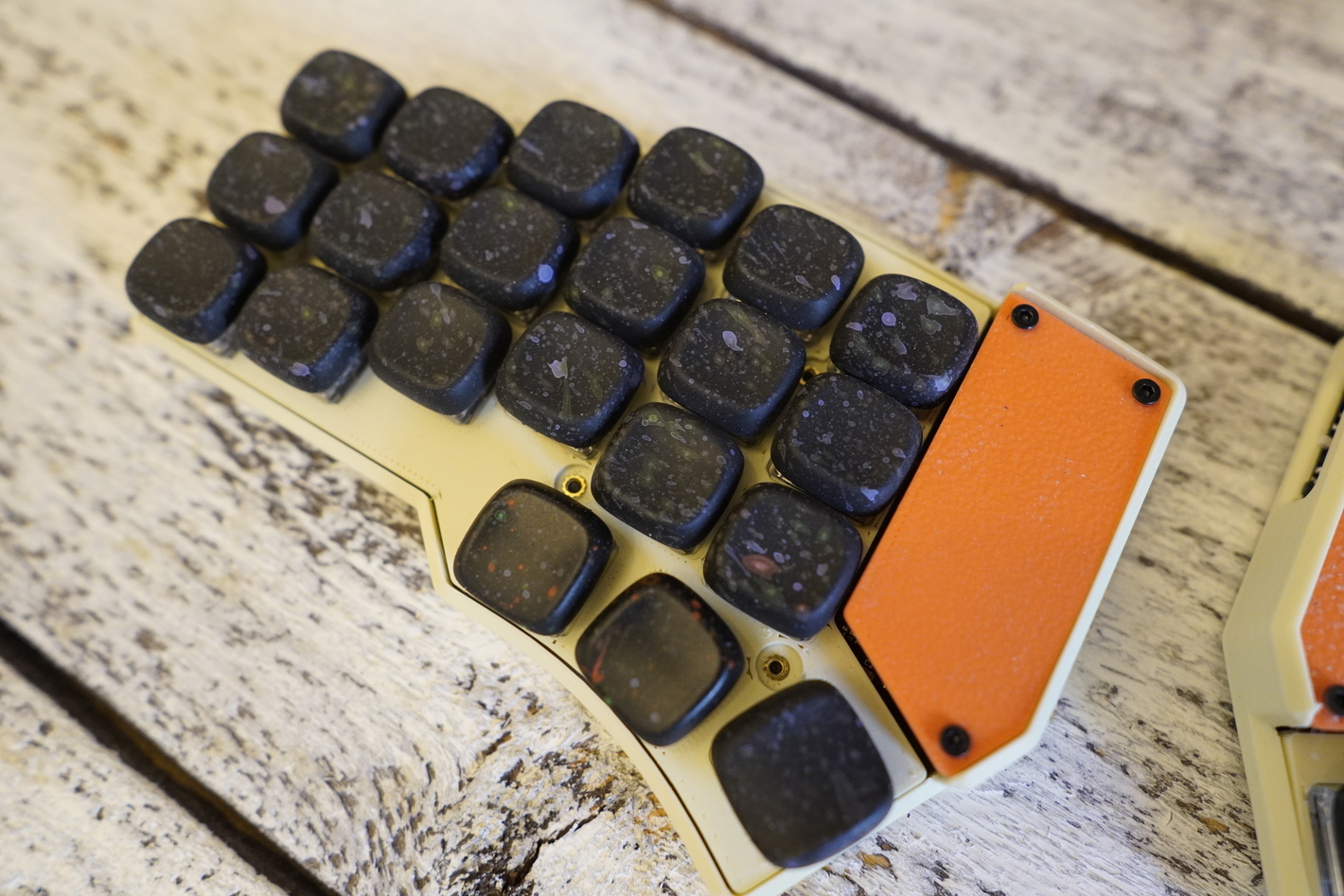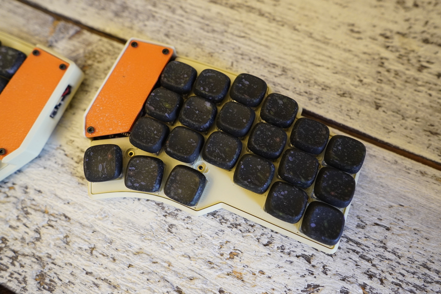 Раздельная низкопрофильная клавиатура DAO В каждой половине батарея по 300mah Свитчи в клавиатуре низкопрофильные Kailh Choc Silver Капы стоят KLP LAME CHOC от @braindefender. Это капы с моим любимым профилем. Разпечатаны на фотополимернике 9k из композитной rigid смолы с керамической крошкой. Корпус сделан максимально тонким, тут не используются спейсеры, плата прилегает плотно к низу и верху корпуса. Работает на ZMK