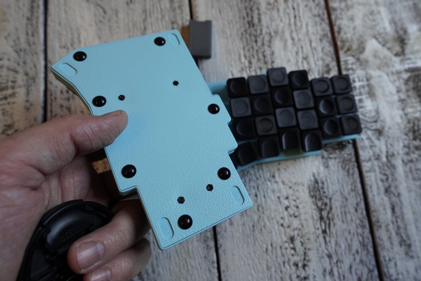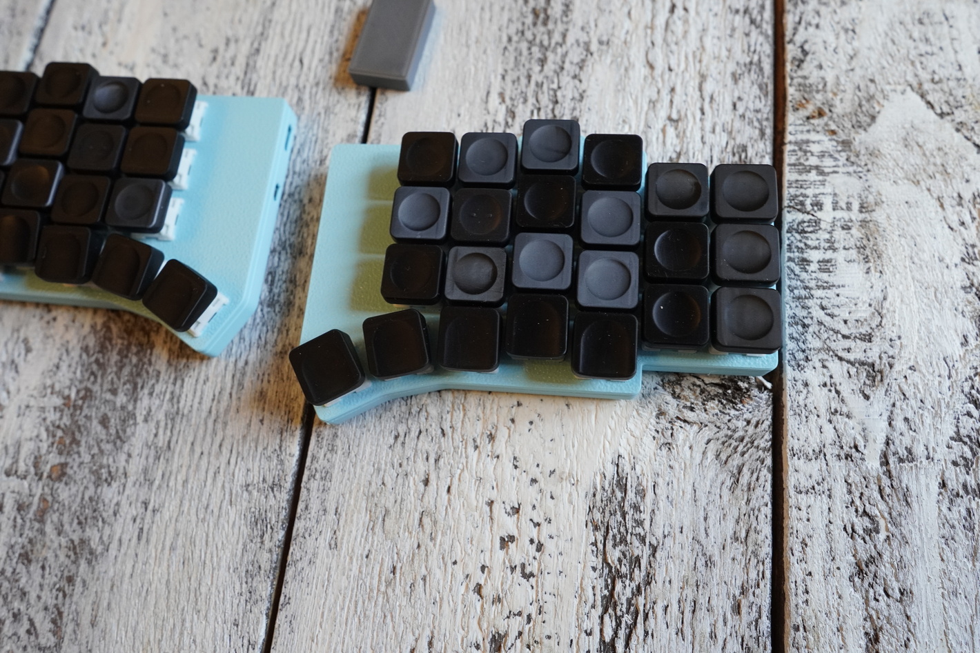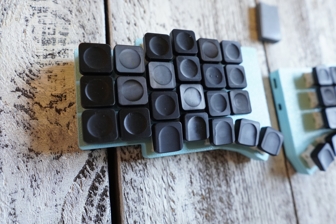 Раздельная механическая клавиатура Flake В данной клавиатуре интересно реализована поддержка разных свитчей. По факту сюда можно вставить как MX свитчи так и чоковские свитчи. При вставлении MX свитчей добавляется дополнительный плейт. Его можно увидеть на последней фотке. Свитчи в этой клавиатуре тактильные сайленты - outemu silent cream yellow Капы - GammaCaps черного цвета напечатанные из фотополимерной смолы по технологии SLA из композитной смолы с керамической крошкой Клавиатура работает через донгл (но можно и легко перепрошить и клавиатура будет работать без донгла). Работает на ZMK
