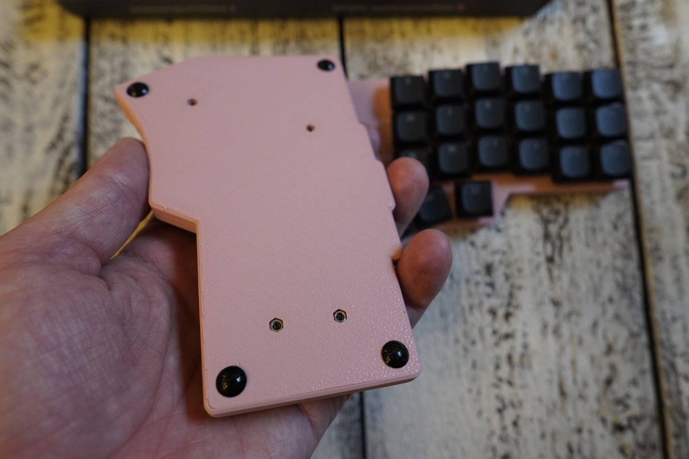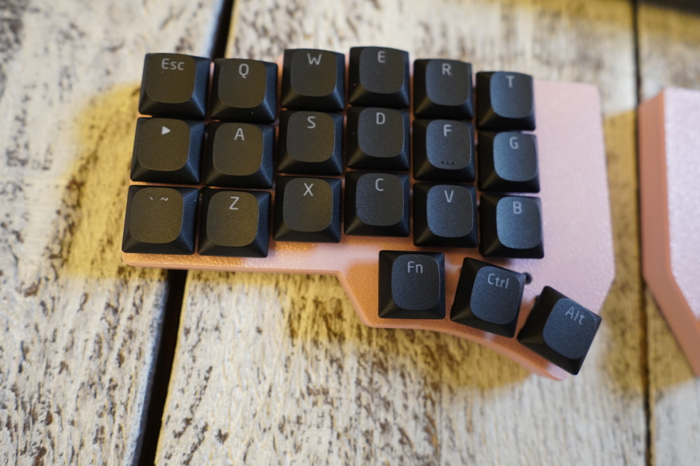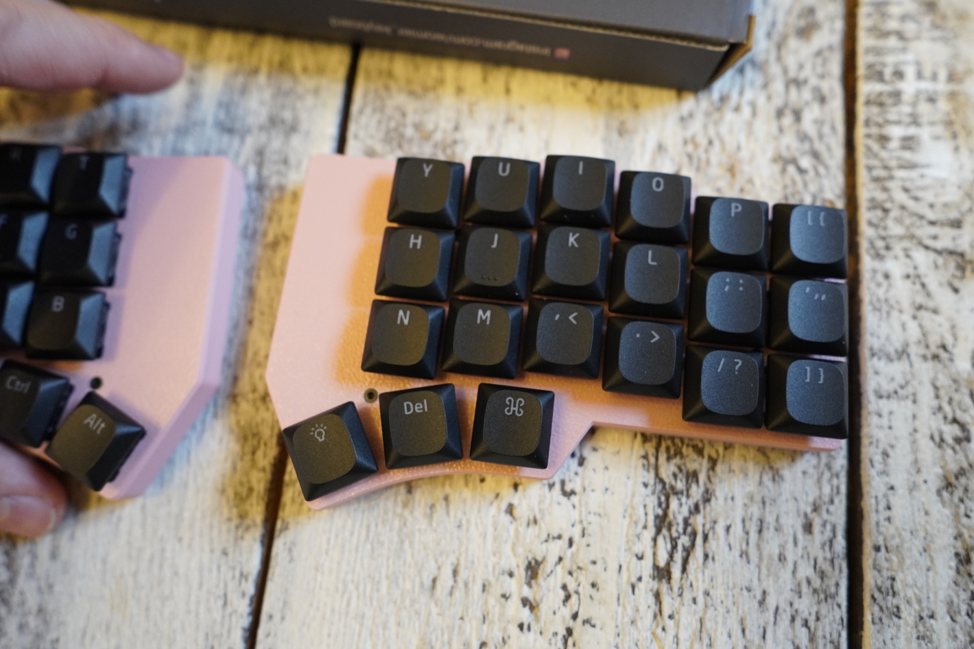 Корпус розового цвета Свитчи низкопрофильные ks33 banana, тактильные, есть хотсвап Капы низкопрофильные как на картинке. В комплекте идет весь сет капов. Батареи в каждой половине по 250 Получилась прям очень тонкой. Работает на ZMK Капы сюда подходят стандартные MX