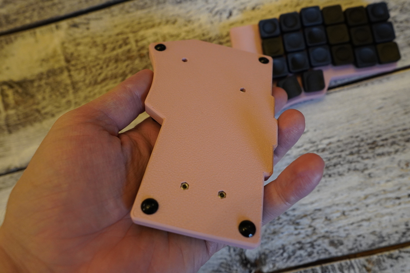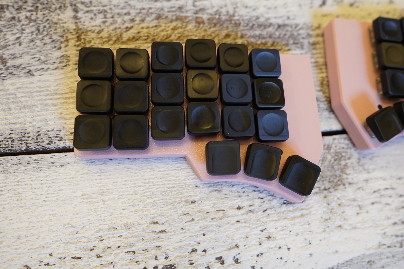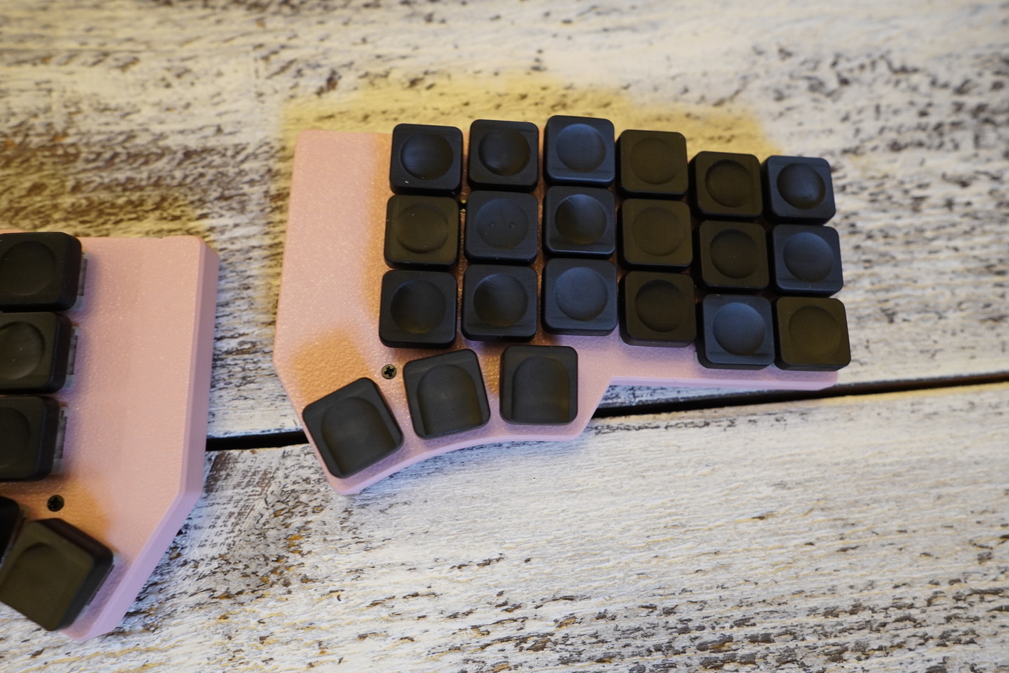 Корпус розового цвета Свитчи низкопрофильные ks33 red, есть хотсвап Капы gammacaps напечатанные по технологии SLA, напечатаны из композитной смолы с керамической крошкой Батареи в каждой половине по 250 Получилась прям очень тонкой. Работает на ZMK Капы сюда подходят стандартные MX