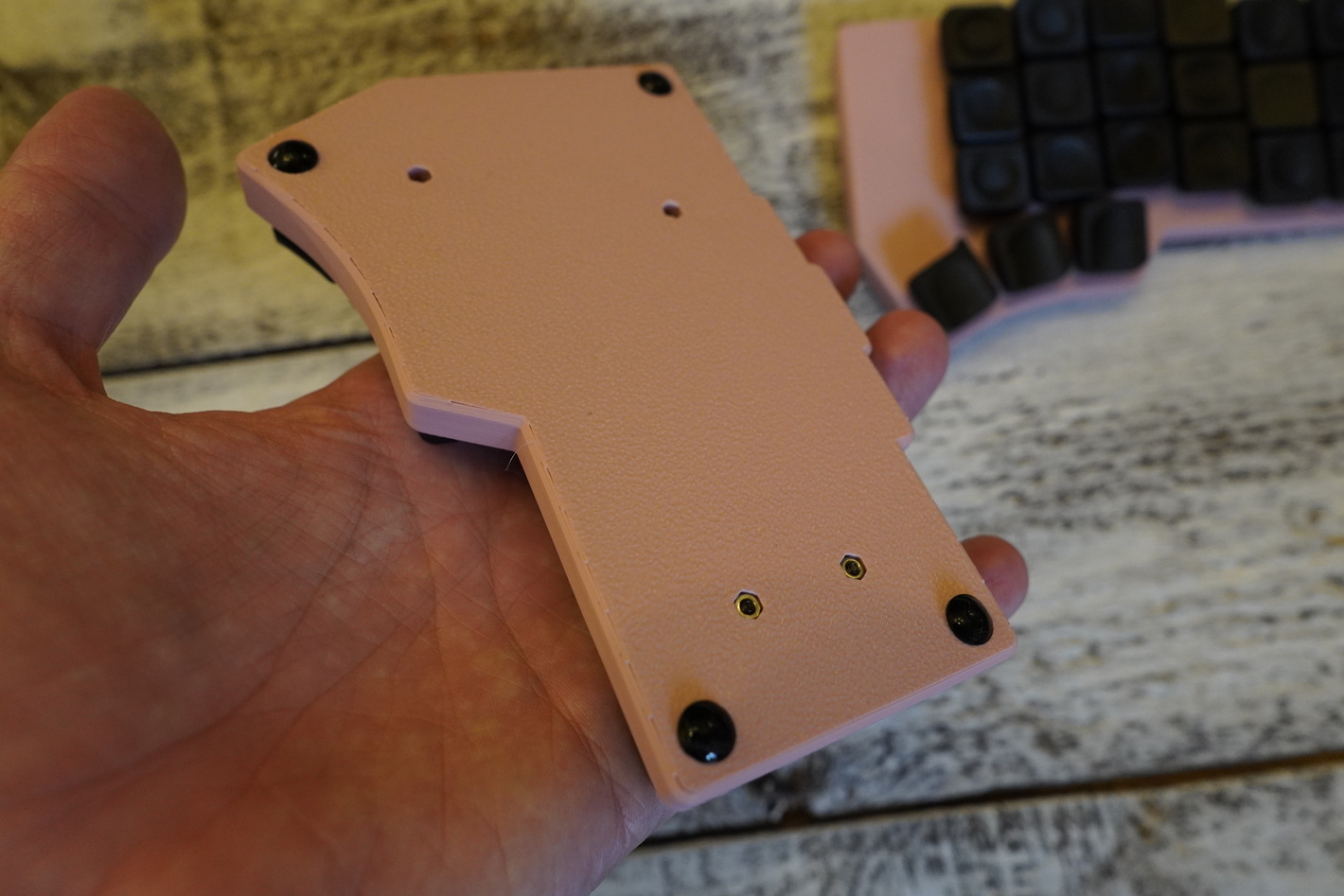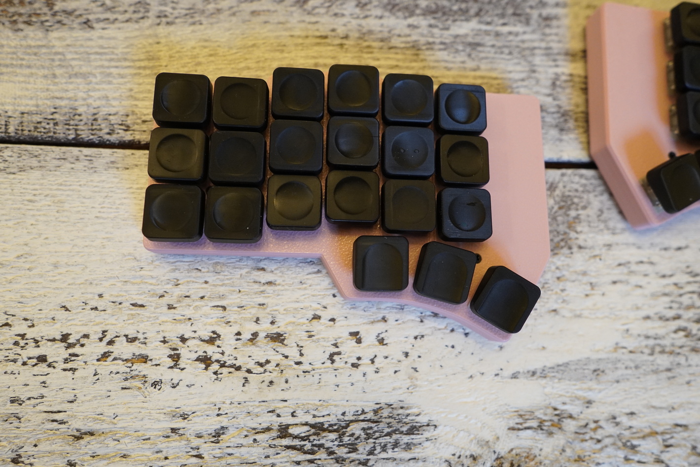 Корпус розового цвета Свитчи низкопрофильные ks33 brown, тактильные, есть хотсвап Капы gammacaps напечатанные по технологии SLA, напечатаны из композитной смолы с керамической крошкой Батареи в каждой половине по 250 Получилась прям очень тонкой. Работает на ZMK Капы сюда подходят стандартные MX