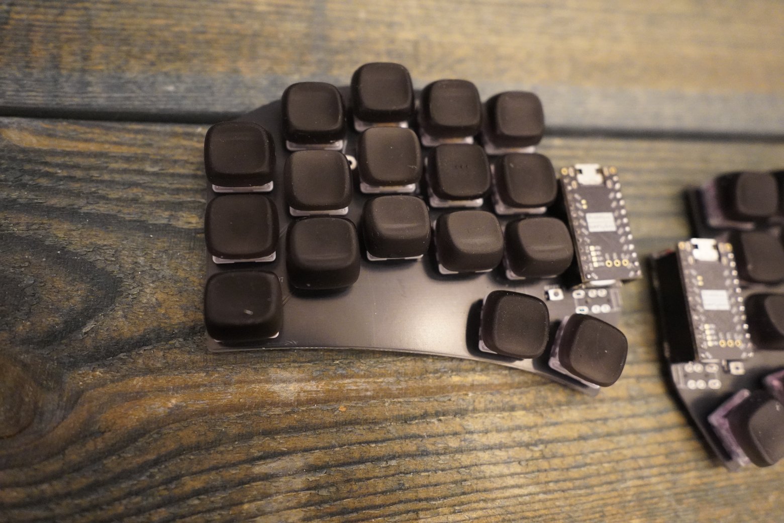 Sweep на свитчах Kailh Saker Капы KLP Lame напечатанные на фотополимерном принтере по технологии SLA из rigid смолы (это что-то типа композитной, прочной смолы в которую добавлена керамическая крошка). Капы сделал braindefender, посмотреть можно тут - https://github.com/braindefender/KLP-Lame-Keycaps батареи под контроллером работает на ZMK