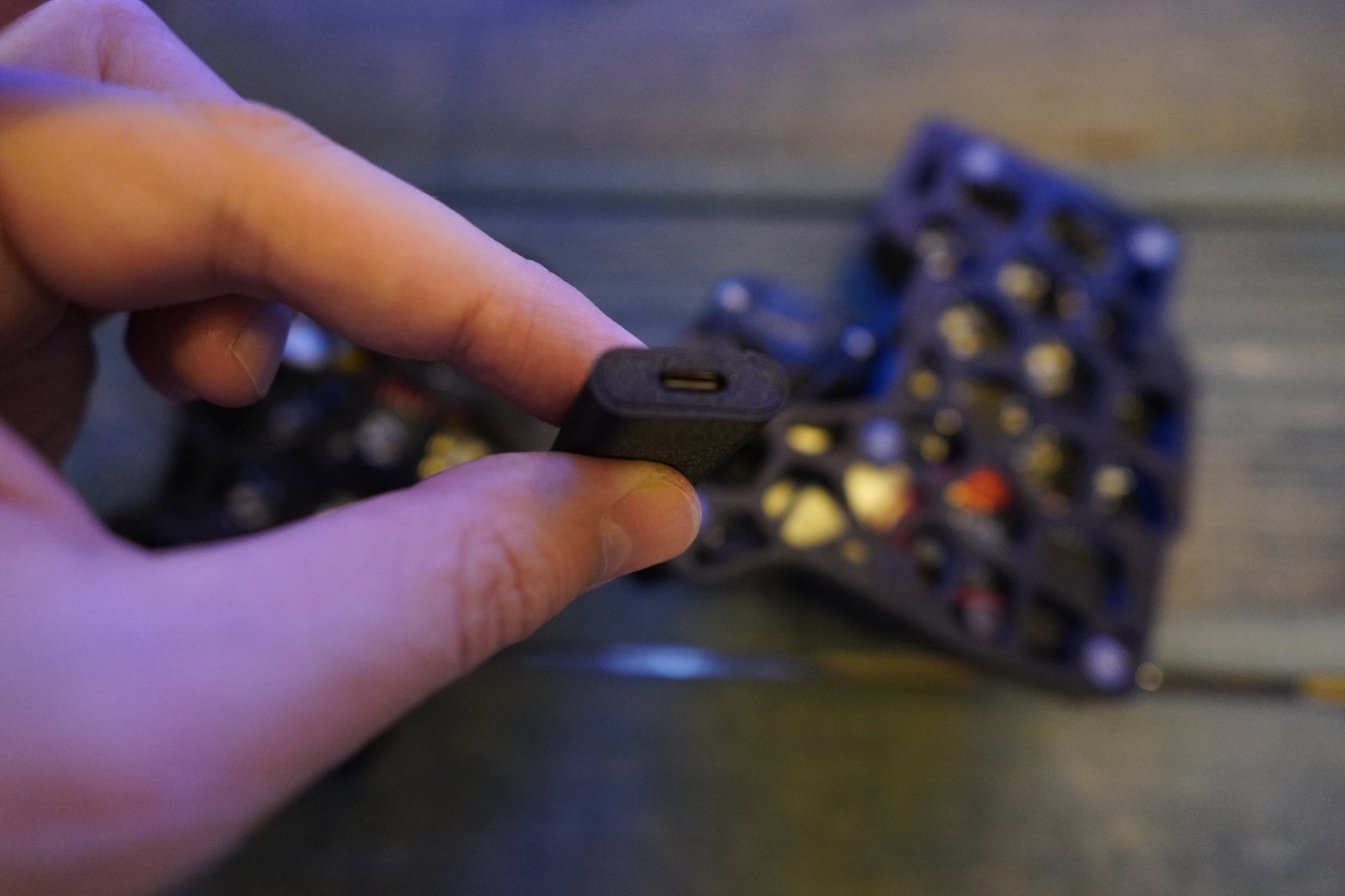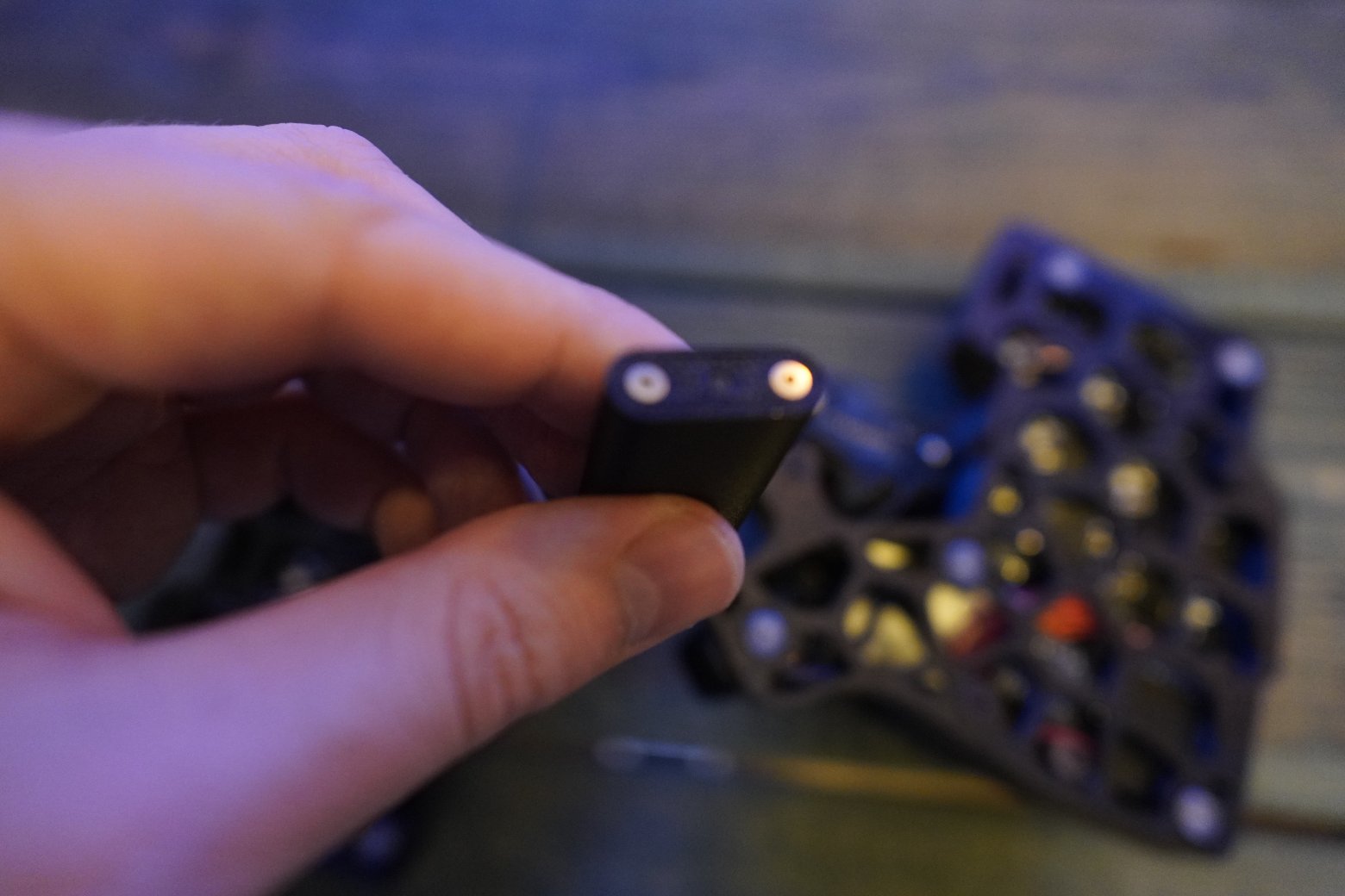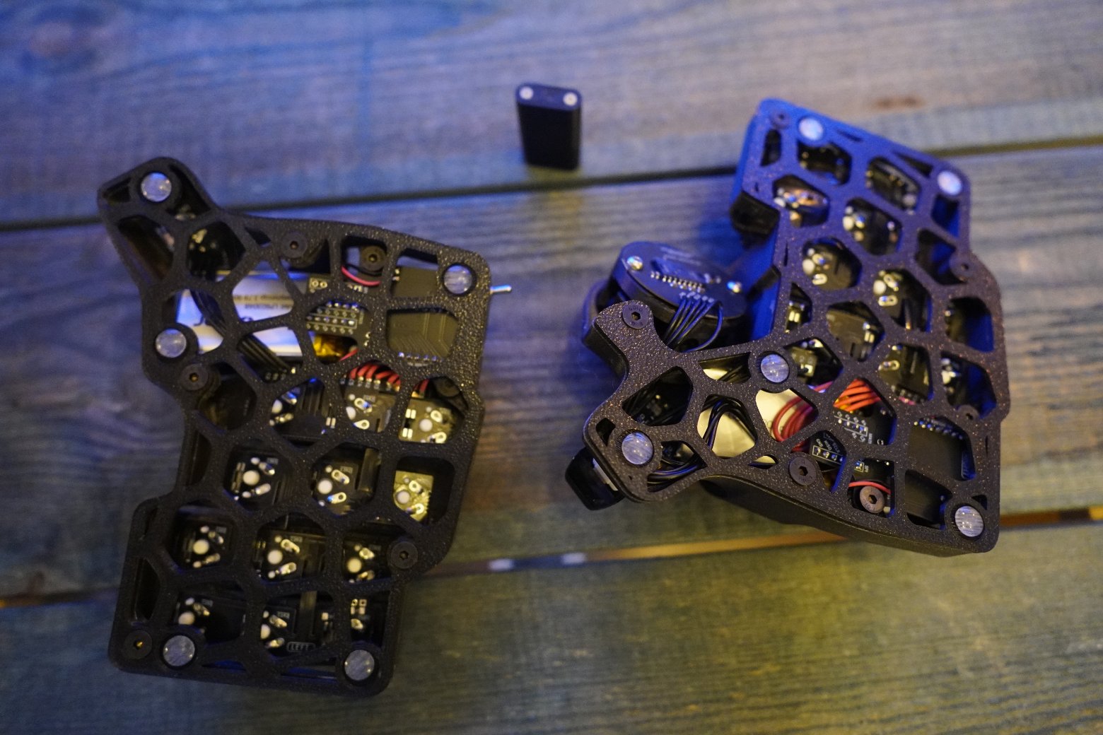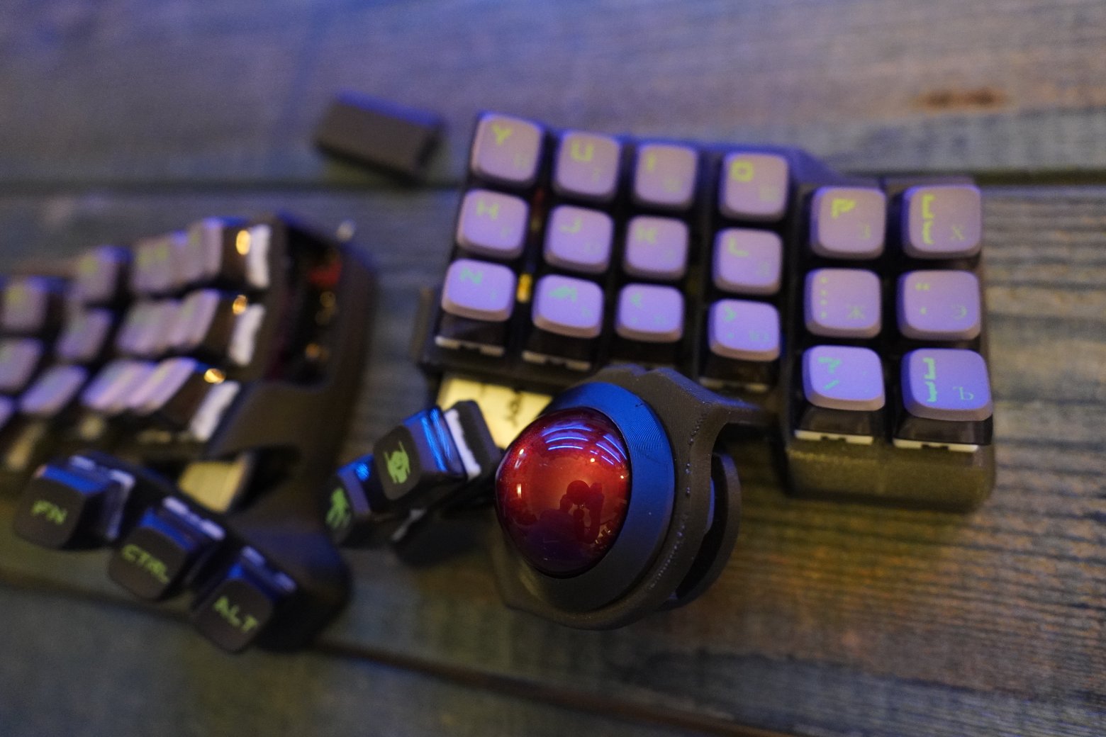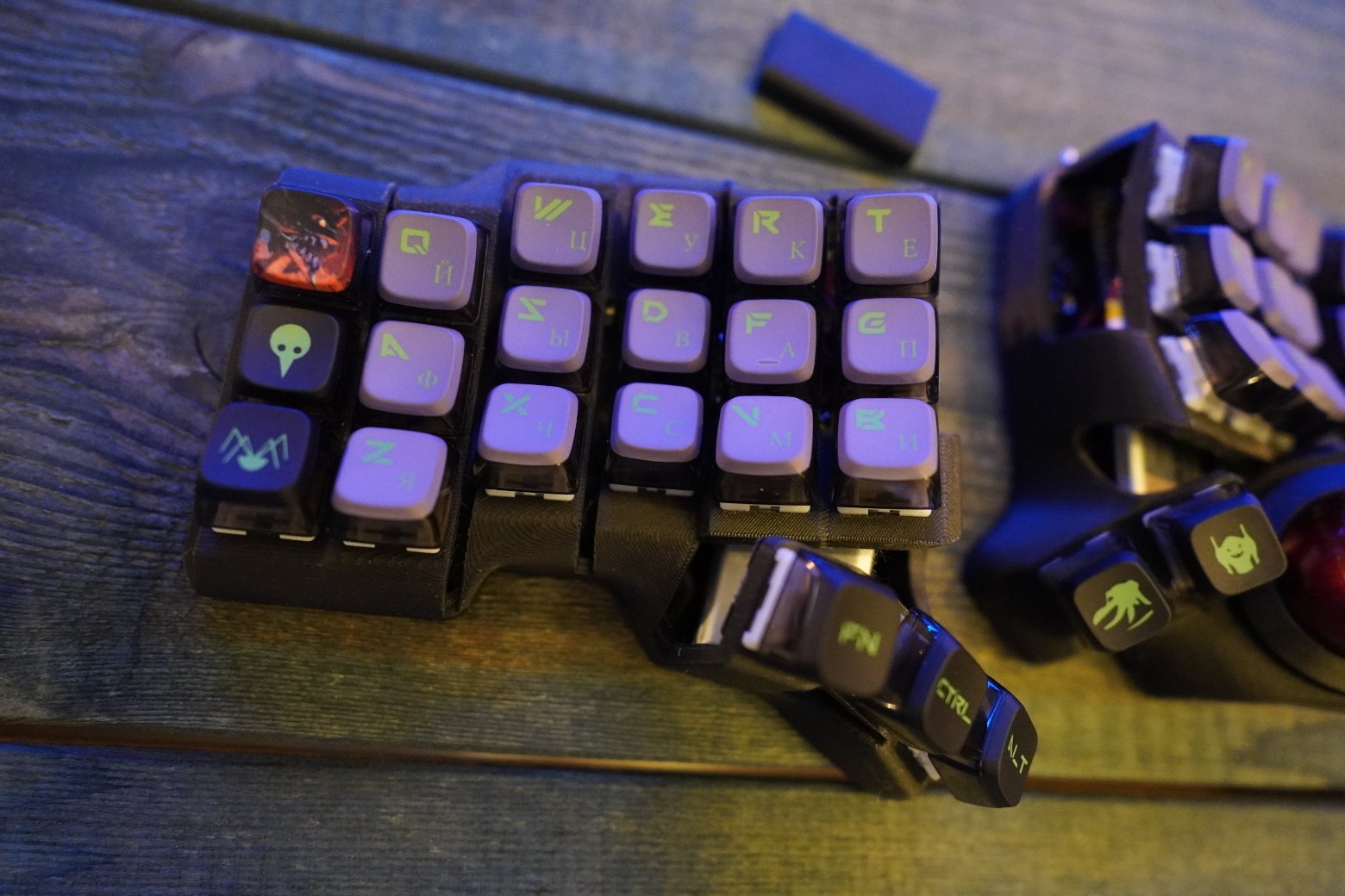 Корпус напечатан из композитного угленаполненного пластика. Черного цвета. Шар красного цвета PERIXX Свитчи беззвучные тактилки Outemu silent cream yellow Капы как на фото Клавиатура работает на прошивке ZMK. Поддерживается ZMK STUDIO, это графическая программа которую можете скачать как нативно, так и использовать в браузере и там менять раскладку. С ней вообще можно не перепрошивать клавиатуру чтобы менять раскладку, можно все делать в графическом режиме. На клавиатуре установлена вот эта прошивка - https://github.com/devpew/charybdis-3-6-dongle-prospector-studio, если нравится то поставьте репе звездочку. Клавиатура работает через донгл. Про донглы можете почитать тут - https://ergosplits.ru/blog/dongles. Кстати если хотите работать с клавиатурой без донгла, то это не проблема, можно перепрошить и работать с ней просто по блютусу. В каждой половине есть батареи по 800mah, клавиатура будет жить на этой батарее два-три месяца. Установлена поддержка шара, которая напечатана по SLA