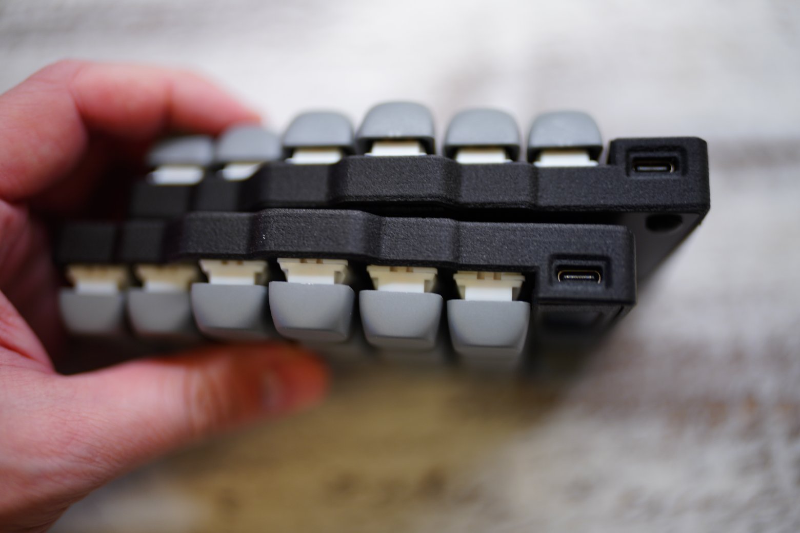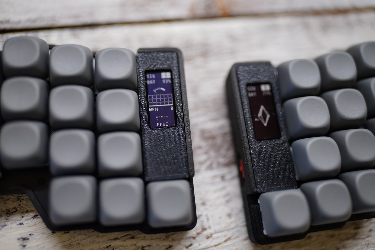 Раздельная беспроводная клавиатура которую сделал themaxbang, которая называется MRIYA Работает на ZMK, имеет два e-INK экрана на котором можно смотреть заряд батареи, слои и тд Есть хотсвап, установлены свитчи MX Outemu siltent cream yellow Капы как на картинке Корпус напечатан их угленаполненного пластика Батареи по 100mah под контроллером