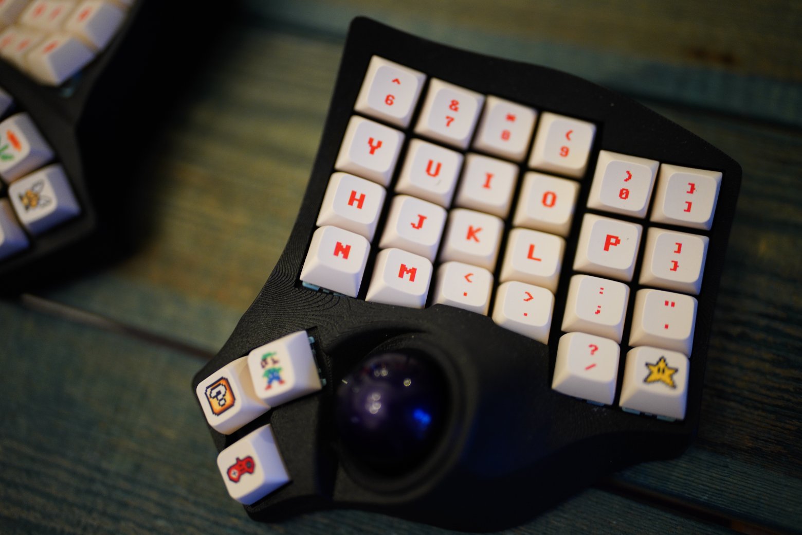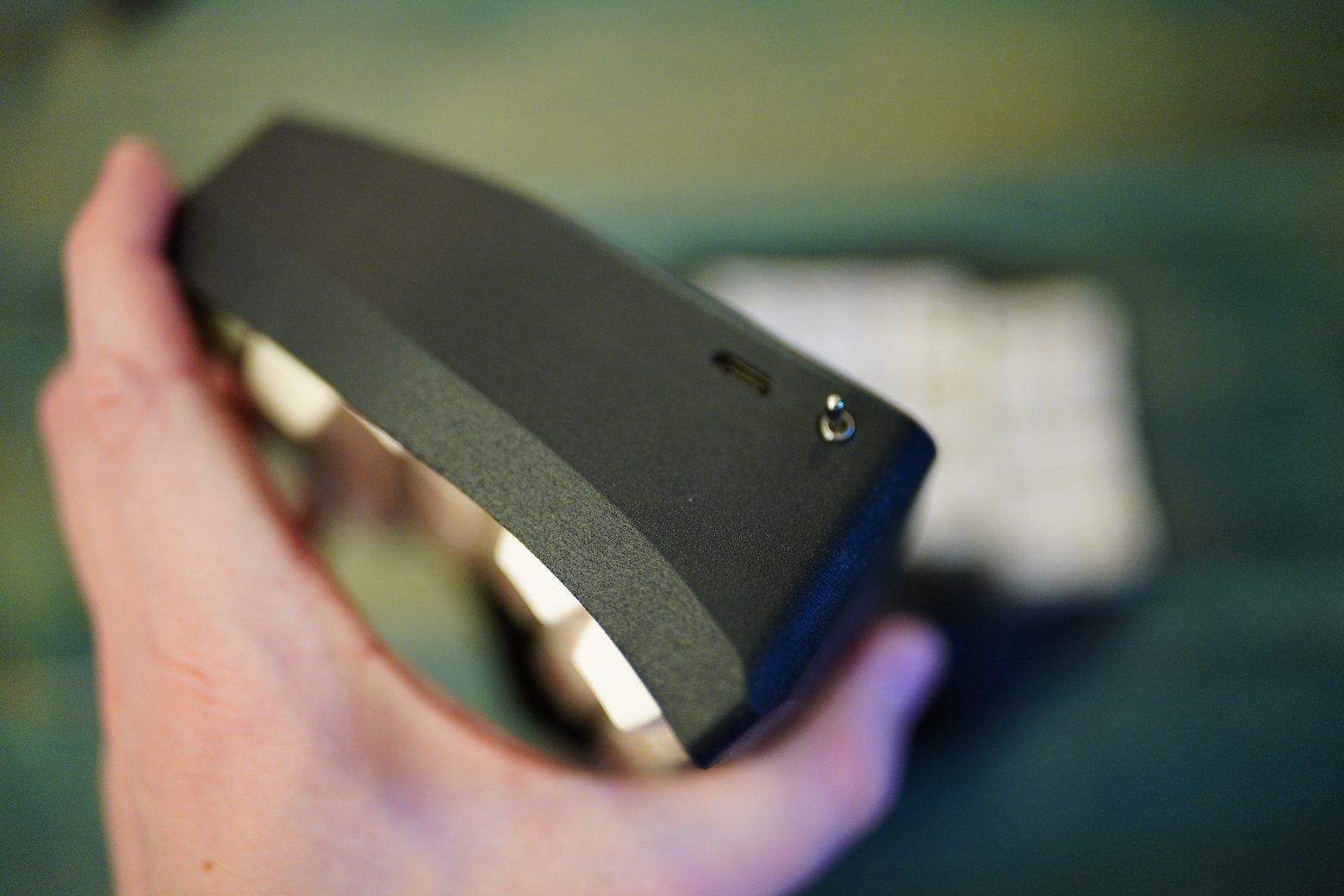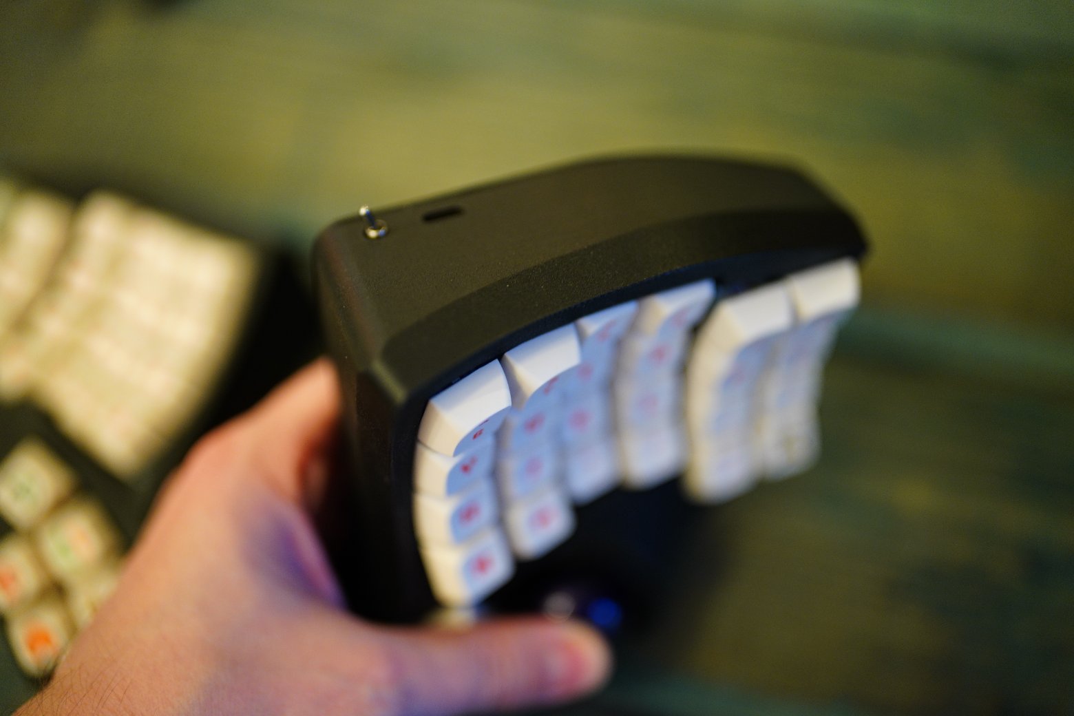 Charybdis 4-6 в корпусе новой версии. Сам корпус напечатан из композитного угленаполненного материала. На корпусе новые выключатели (если раньше они были снизу, то теперь это переключатель сзади). Сам корпус темно-серого цвета. Сам корпус зашкурен, покрашен и вскрыт лаком. Это беспроводная версия клавиатуры. Работает на ZMK. Батареи по 1100 и 900mah. Работает через донгл. Донгл с кнопкой. Свитчи - Sea Salt Linear В клавиатуре шар perixx Капы как на картинке В комплекте с кейсом для переноски