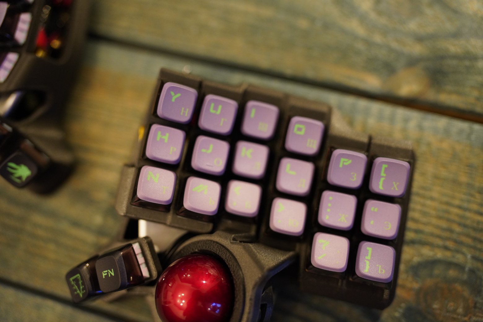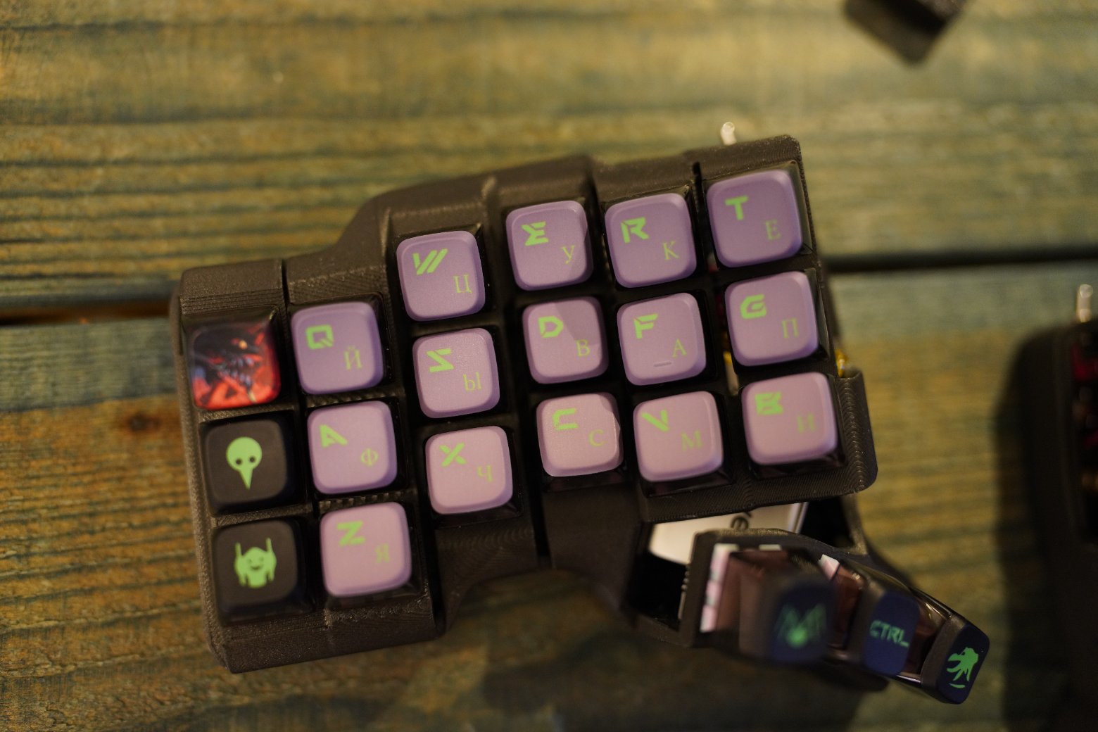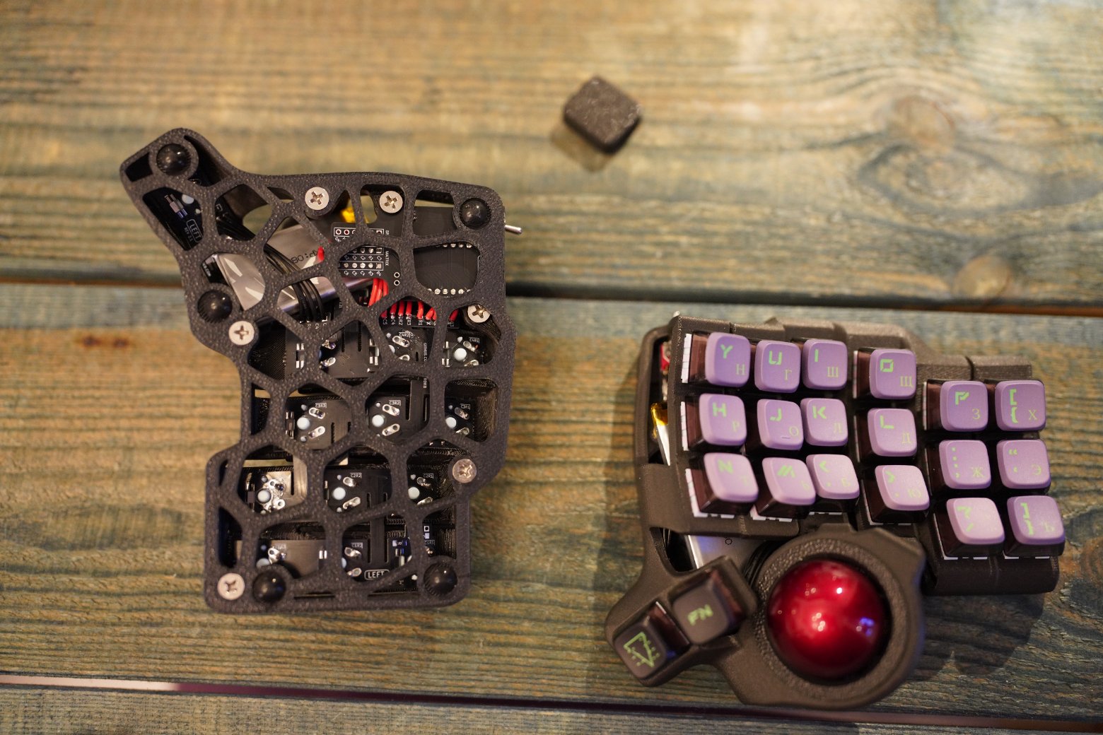 Корпус напечатан из композитного угленаполненного пластика. Черного цвета. Шар красного цвета PERIXX Свитчи беззвучные мягкие, легонькие Kailh Saker Капы как на фото Клавиатура работает на прошивке ZMK. Поддерживается ZMK STUDIO, это графическая программа которую можете скачать как нативно, так и использовать в браузере и там менять раскладку. С ней вообще можно не перепрошивать клавиатуру чтобы менять раскладку, можно все делать в графическом режиме. На клавиатуре установлена вот эта прошивка - https://github.com/devpew/charybdis-3-6-dongle-prospector-studio, если нравится то поставьте репе звездочку. Клавиатура работает через донгл. Про донглы можете почитать тут - https://ergosplits.ru/blog/dongles. Кстати если хотите работать с клавиатурой без донгла, то это не проблема, можно перепрошить и работать с ней просто по блютусу. В правой половине батарея 1100mah, в левой 800mah, клавиатура будет жить на этой батарее два-три месяца.