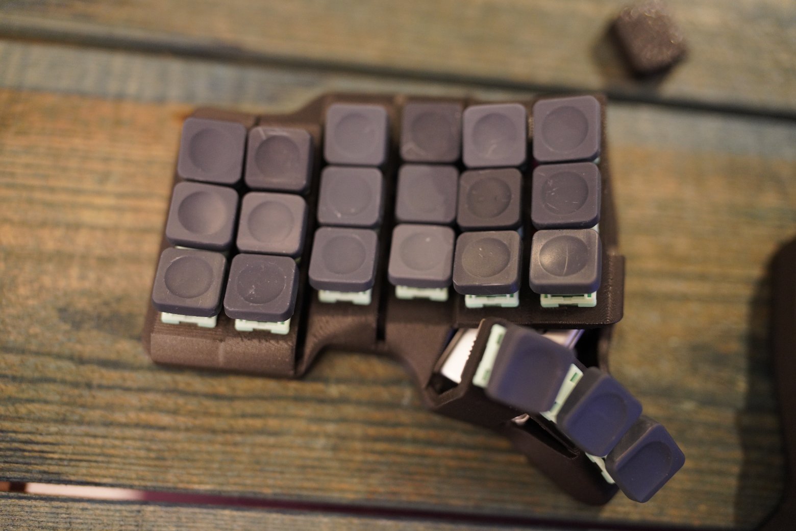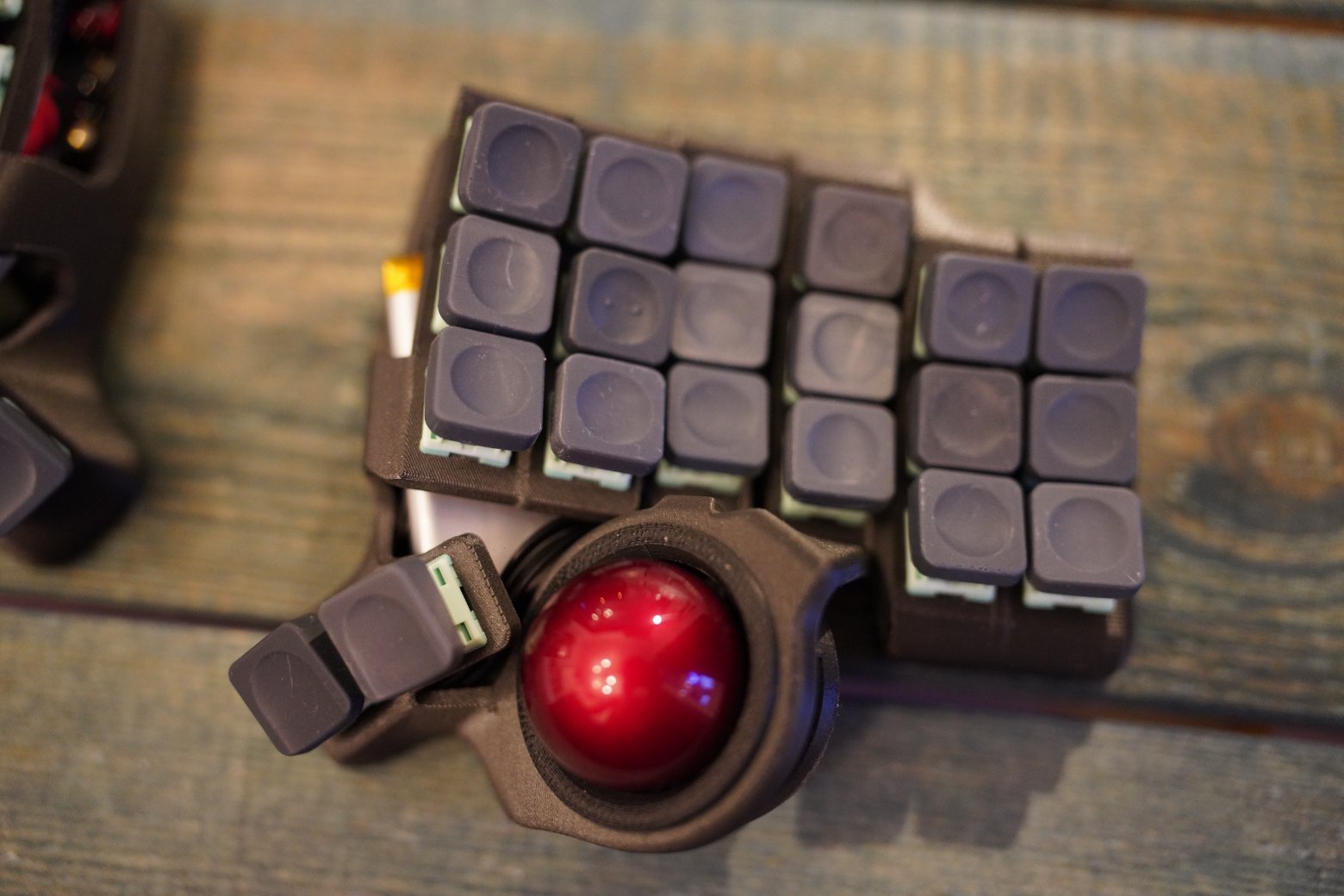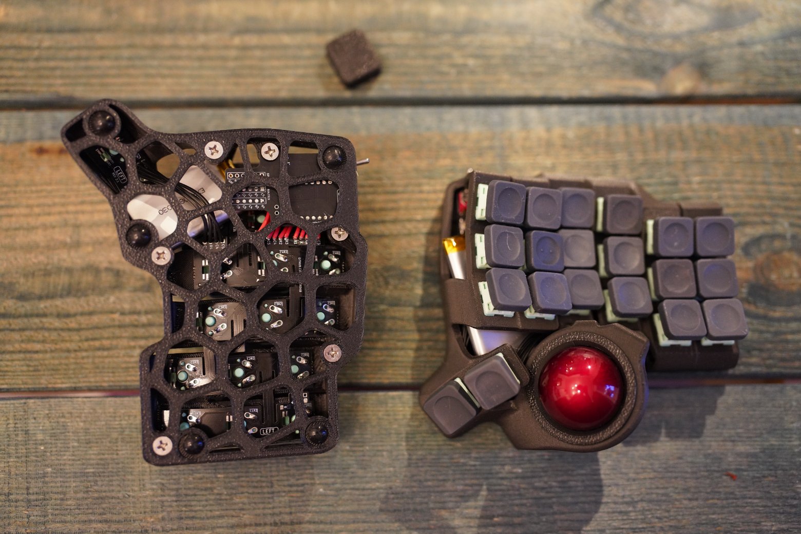 Корпус напечатан из композитного угленаполненного пластика. Черного цвета. Шар красного цвета PERIXX Свитчи тактилки Akko Silantro Switches Капы gammacaps напечатанные на фотополимернике Клавиатура работает на прошивке ZMK. Поддерживается ZMK STUDIO, это графическая программа которую можете скачать как нативно, так и использовать в браузере и там менять раскладку. С ней вообще можно не перепрошивать клавиатуру чтобы менять раскладку, можно все делать в графическом режиме. На клавиатуре установлена вот эта прошивка - https://github.com/devpew/charybdis-3-6-dongle-prospector-studio, если нравится то поставьте репе звездочку. Клавиатура работает через донгл. Про донглы можете почитать тут - https://ergosplits.ru/blog/dongles. Кстати если хотите работать с клавиатурой без донгла, то это не проблема, можно перепрошить и работать с ней просто по блютусу. В правой половине батарея 1100mah, в левой 800mah, клавиатура будет жить на этой батарее два-три месяца.