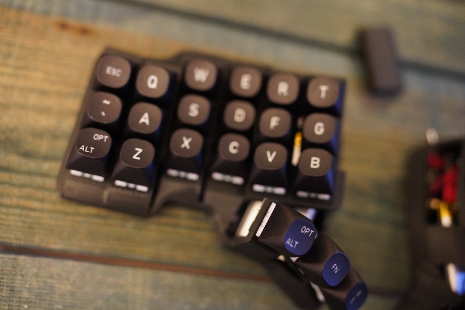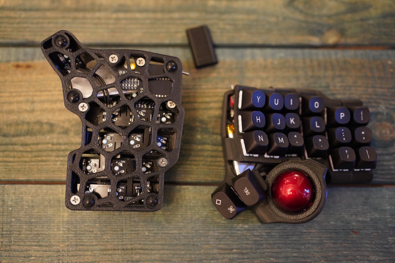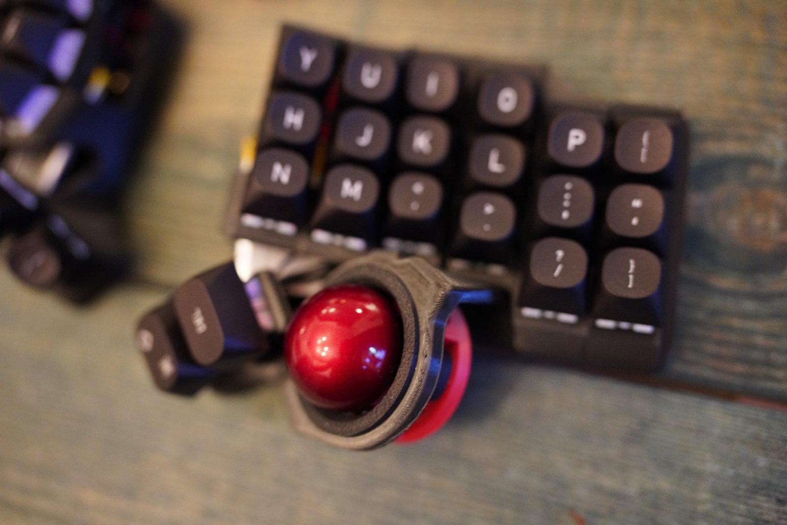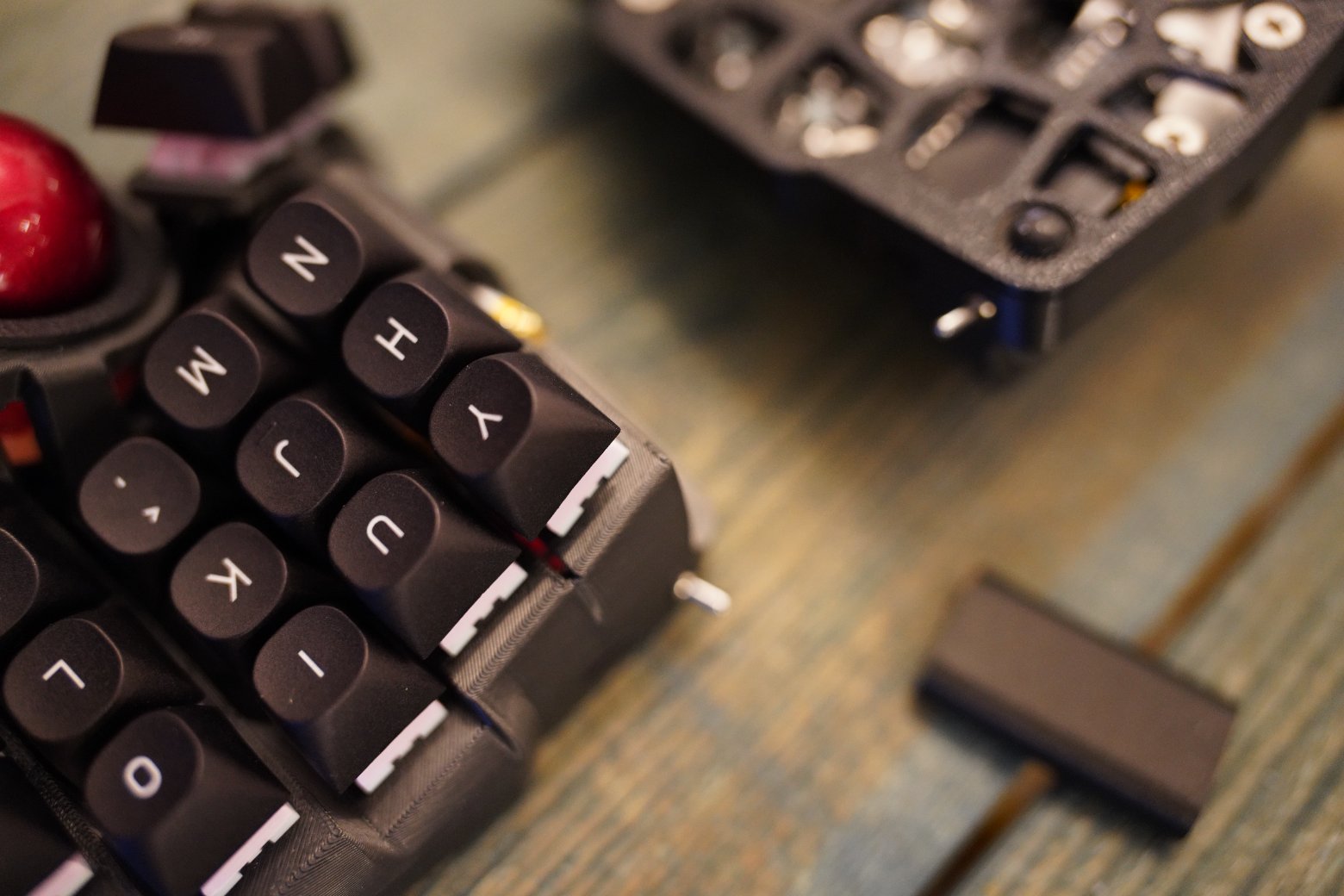 Корпус напечатан из композитного угленаполненного пластика. Черного цвета. Шар красного цвета PERIXX Шар стоит на керамических подшипниках, они заранее смазаны олеофобным покрытием. Свитчи - очень тихие Kailh Saker Linear Switches - 42g Капы как на фото Клавиатура работает на прошивке ZMK. Поддерживается ZMK STUDIO, это графическая программа которую можете скачать как нативно, так и использовать в браузере и там менять раскладку. С ней вообще можно не перепрошивать клавиатуру чтобы менять раскладку, можно все делать в графическом режиме. На клавиатуре установлена вот эта прошивка - https://github.com/devpew/charybdis-3-6-dongle-prospector-studio, если нравится то поставьте репе звездочку. Клавиатура работает через донгл. Про донглы можете почитать тут - https://ergosplits.ru/blog/dongles. Кстати если хотите работать с клавиатурой без донгла, то это не проблема, можно перепрошить и работать с ней просто по блютусу. Батареи по 800mah, клавиатура будет жить на этой батарее два-три месяца.